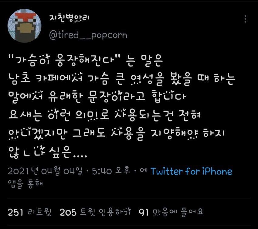 유행도 다 꺼지고 얌전히 관짝에 묻혀있던걸 21년 4월 메퇘지가 발굽으로 후벼파서는 "뭐? 가슴이 웅장? 이기이기 핸넘들 빅젖빠는 여혐용어노 이기" 하면서 주작질을 펼치고 있다.