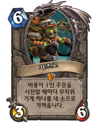 고대놈 공용 전설카드 6코 3/6 내가 비용이 1인 주문을 쓸 때마다 무작위 기계 카드 하나를 내 손으로 가져옵니다.