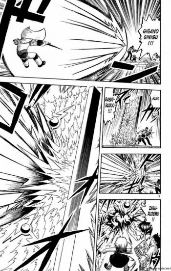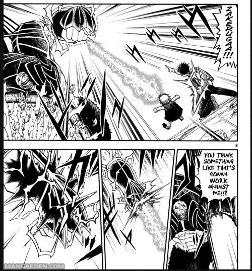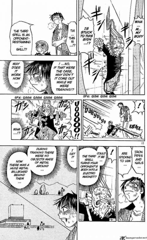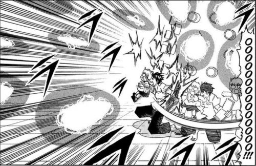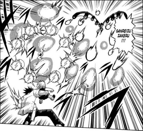 근력 강화 주술. 주문을 외치자 마른 하늘에 날벼락이 갓슈에게 내리치고 무지개 빛이 난다.