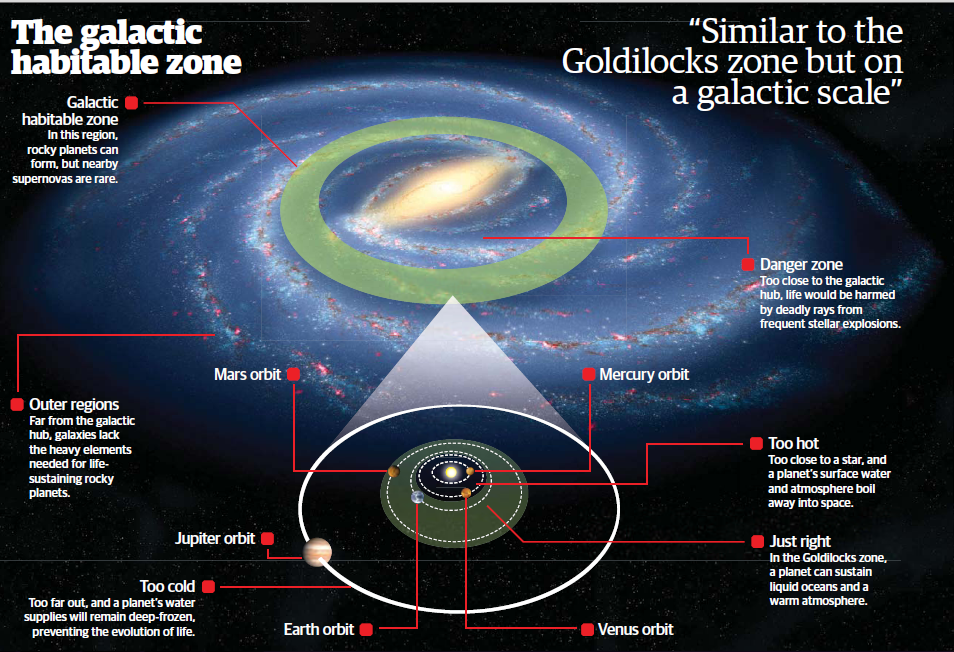 천문학자들은 항성계 안에 있는 '항성 주위 생명체 거주 가능 영역이나 큰 규모의 은하 내에 있는 '은하 생명체 거주 가능 영역에서 생명이 태어날 확률이 크다고 생각한다.