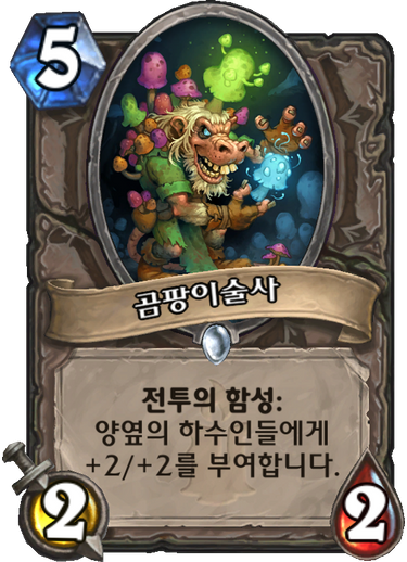코볼트 공용 일반카드 5코 2/2 전투의 함성:양 옆의 하수인들에게 +2/+2를 부여합니다. (버프명은 마법 버섯)