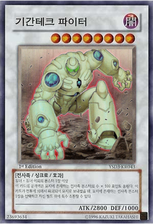 전투 파괴시 묘지의 전사족 몬스터를 소생시키는 임의 발동 유발효과인데 기간테크 파이터가 자폭하고 묘지로 간 시점에서 효과가 발동되기 때문에 자기 자신을 다시 퍼올릴 수 있다.