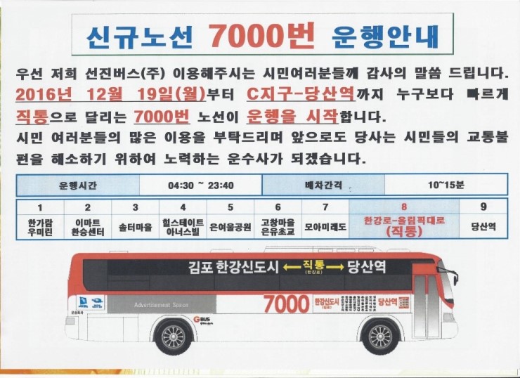 당시 노선개통 안내문이다. 공문에 "누구보다 빠르게"와 같은 문구를 넣는 곳은 킬포선진이 최초일 것이다.