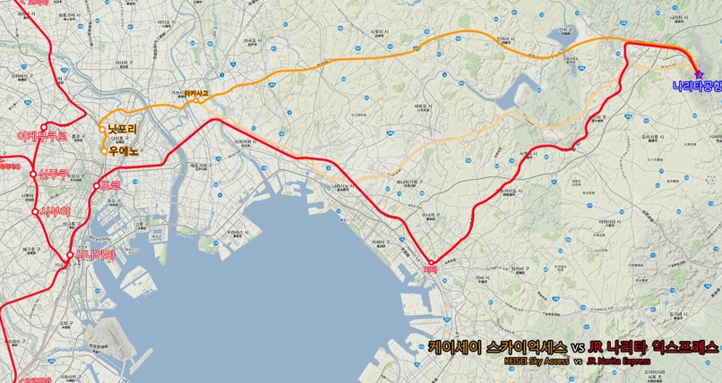 노란 선이 케이세이 선이고, 빨간 선이 나리타 익스프레스이다.케이세이 스카이라이너는 신칸센급의 빠른 속도를 자랑하는 열차이다. <- 근데 그렇게 빠른 열차가 케이세이 본선에만 들어가면 일반열차보다 느린 개병신 열차로 돌변한다는 게 개좆같은 상황이라 요즘에는 나리타 익스프레스랑 동급으로 타면 병신열차가 되어버렸다.