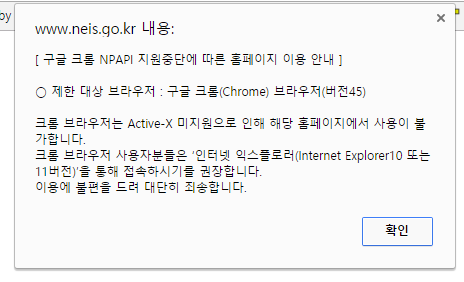 내가 크롬으로 보안프로그램 다깔고 나이스 접속해봤는데 IE만 지원하는 MaWebSAFER_KERIS 땜에 접속이 안되고 있다 씨발 이거 언제쯤 고쳐야 되나 씨발 니 머가리에 IE가 박힌 좆충들아 빨리 개선 좀 해라 제에에발 애좀 먹이게 하지말고 앙?