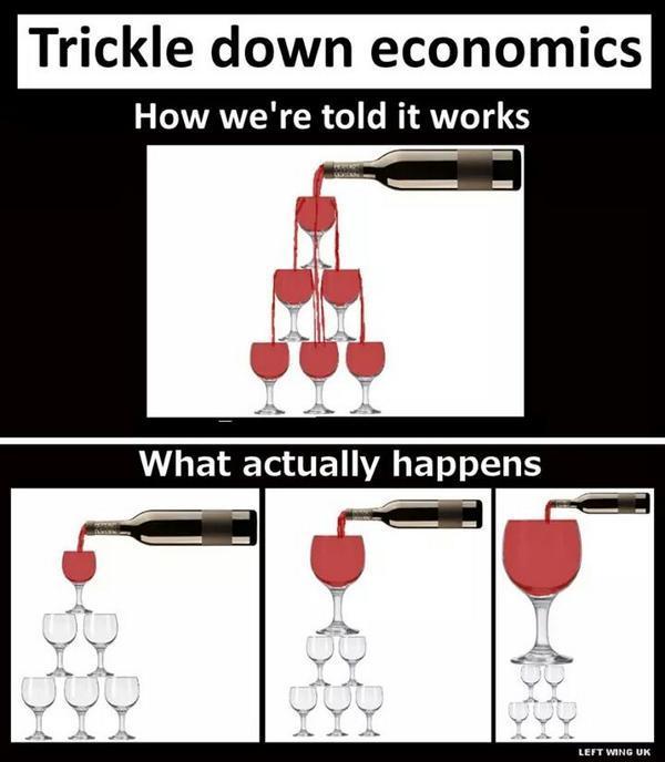기업이 잘 되어야 국민들도 잘 산다? 기업이 잘 살면 기업과 금수저가 많이 그만큼 소비하고 국민들에게 보답과 떡고물이 많이 떨어져서 다 같이 잘 살아진다는 엄청나게 순진한 소리다. 그러니까 잔이 피라미드 형식으로 쌓여져 있다고 가정하면 가장 위의 잔이 꽉차면 넘치는 물이 아래 잔까지도 꽉 차게 된다는 건데...