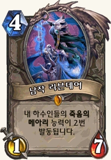 낙스라마스 전설출신으로 4코스트에 스탯은 개쓰레기(1/7)지만 효과(자신의 하수인 죽음의 메아리 2번 발동시키기)가 전설이다.