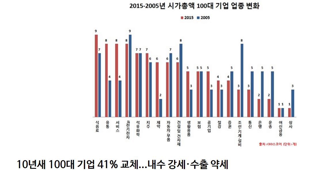 저 기사가 짤렸지만 내용 보면 철강 제철 등 수출 산업은 뒤로 떨어지고 그 자리를 내수 산업이 막 치고 들어갔음