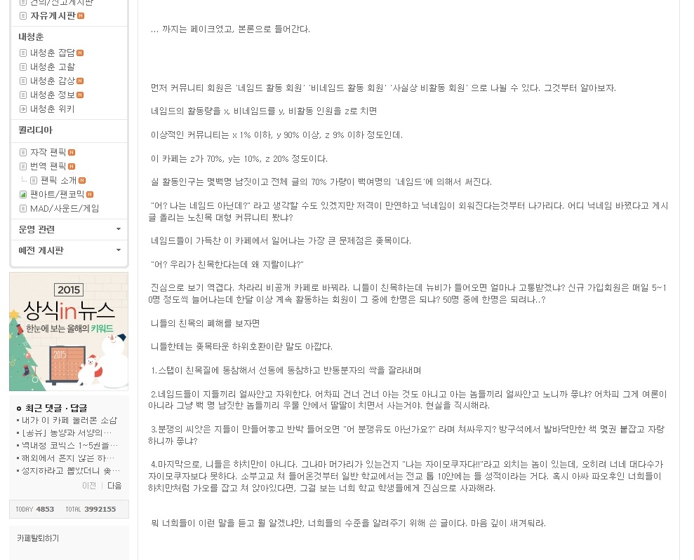 놀라운 건, 카페 스태프가 아닌 매니저가 정치글을 금지할 생각이 전혀 없어서 정치 이야기가 판을 칠 수 밖에 없다. 현 시국상황 덕분에 내청코 관련글 보다 정치글이나 뻘글이 더 많아지게 됐다.