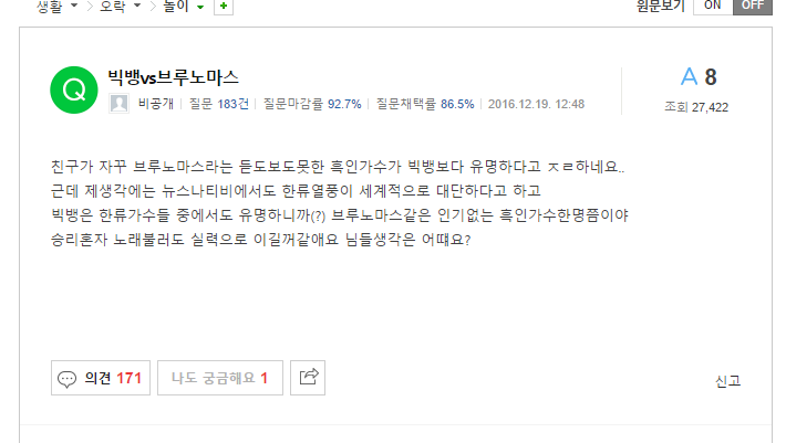 저런 새끼들 90%가 반응이 궁금해서이다. 애새끼들 부들부들 거리는 게 재밌으니깐. 고로 관심 자체를 주지 말자. 애초에 브루노 마스가 누군지 몰랐으면 저런 글도 안 썼겠지.