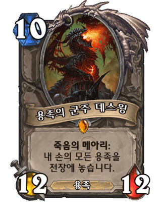 죽메 터지면 이득이 짱짱이지만 솔직히 10코 12/12는 너무 무겁고 제압기 맞았을 때의 리스크도 크다. 결과적으로 잘 안 쓰인다. 주류인 용덱이 없는데 용템포 전사는 주류덱이지만 용템포가 이런 무거운 카드 쓸리가 없다.