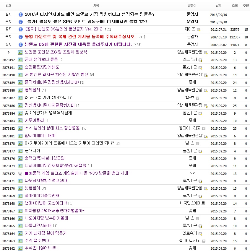 맨날 보던놈들만 보이니깐 좆목이 점점 심해지고 있다. 글도 똥글 내지 씹덕글로 리젠되고 있다.