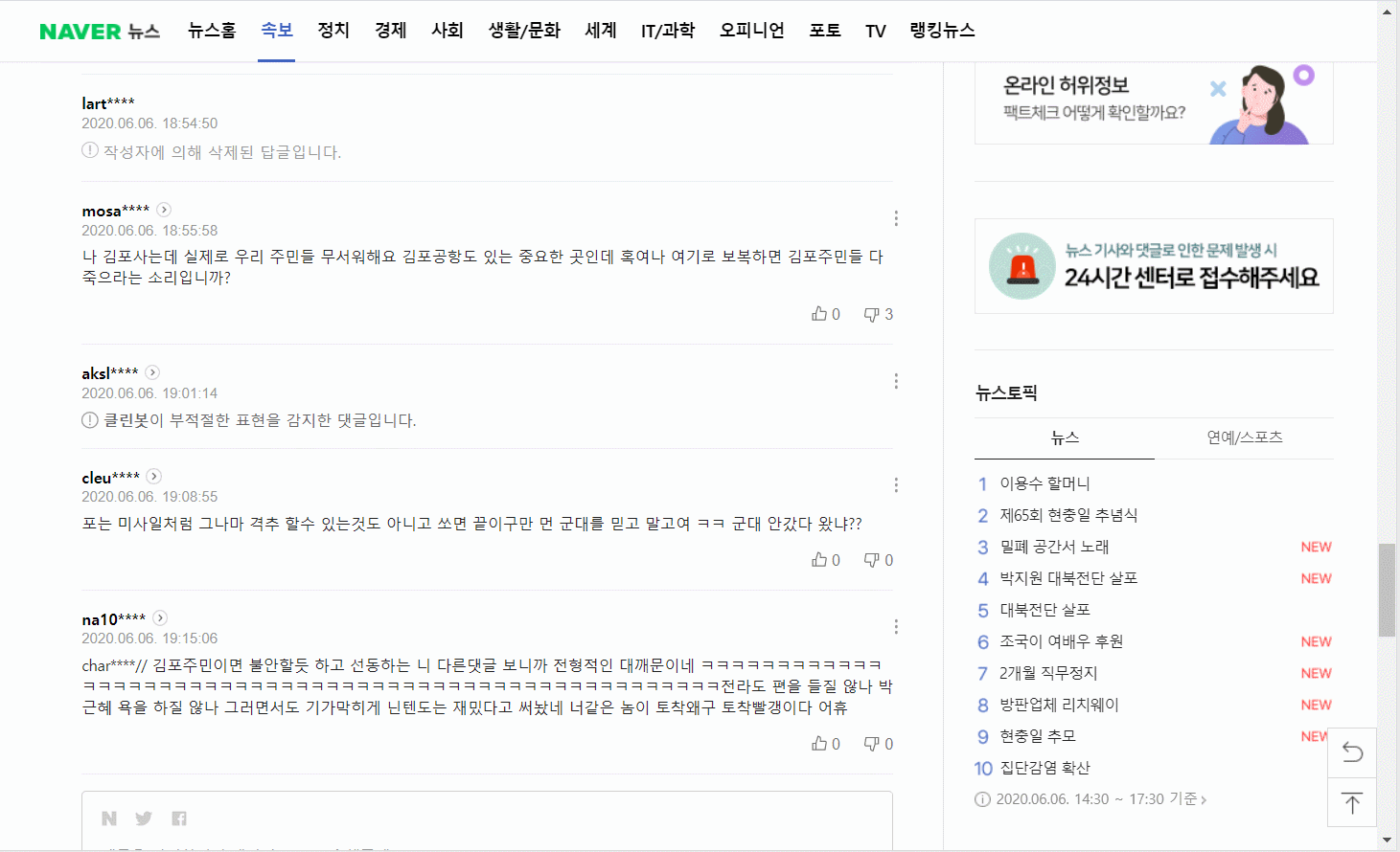 초록집 정치 뉴스의 댓글란의 공감순 나열 기능이 폭파 당하고 정치 뉴스란에서 활동이 힘들어지자 경제, 사회 뉴스의 댓글란에서 행패를 부린다 카더라.
