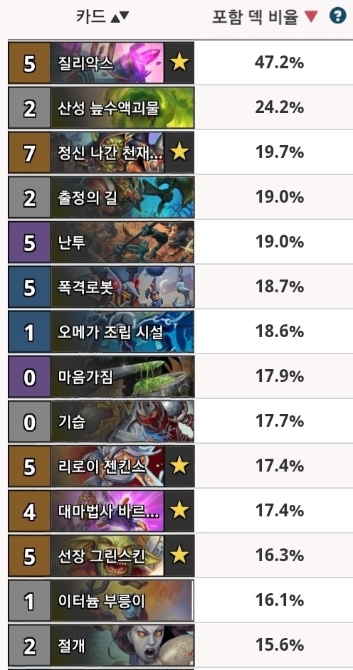 상위권엔 이거 안넣는 방밀/폭탄전사, 졸개도적, 미라클법사, 야수냥꾼 4직업이 완전히 먹어버려서 그냥 하린이나 쓰는 카드 정도로 전락해버렸다.