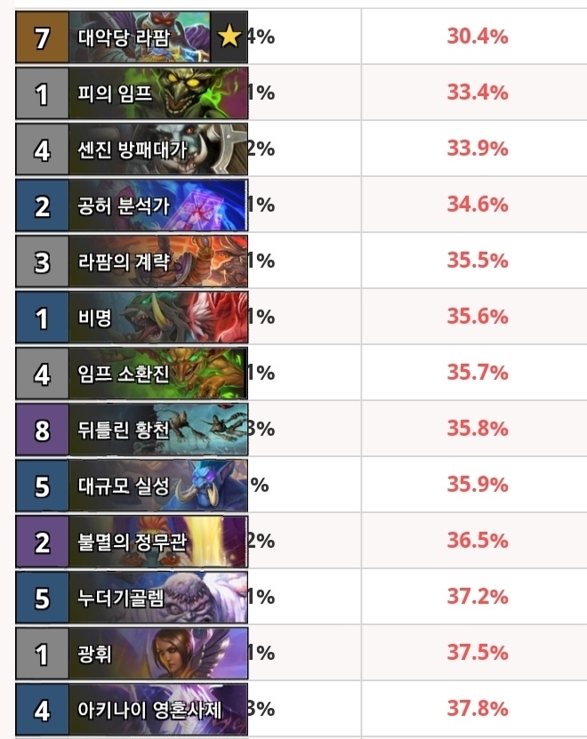 보통 탈진전까지 게임을 끌고 가는 흑마의 덱은 컨흑마밖에 없는데 모독, 하급 자수정 주문석, 죽기 굴단, 공허군주좆생행으로 정규에선 덱이 삭제되니 티어덱에선 못 쓰고 재미덱에서나 쓰일 듯 하다.