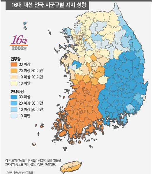 와 딱 반으로 갈렸네...는 노무현이 먹은 곳 중 일부인 서울경기인천만 해도 남한 인구의 절반이다. 본격적으로 시작된 2030 vs 5060 세대의 대결이다.