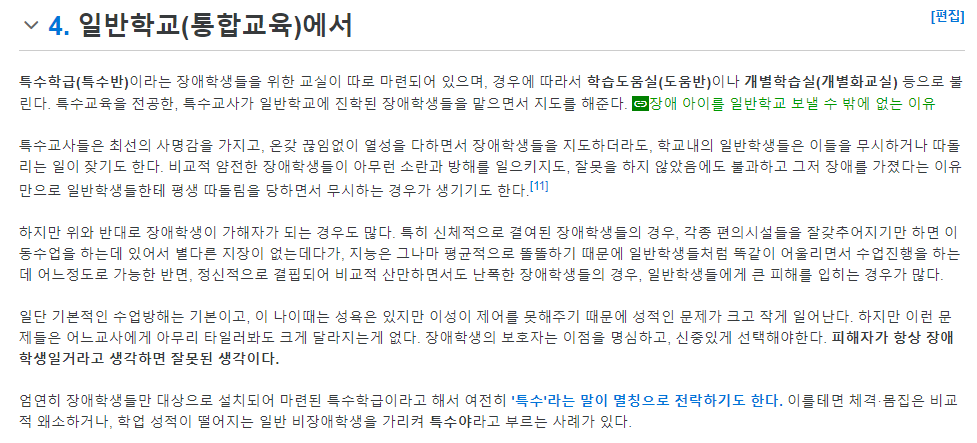 ㄴ솔직히 나도 특수교육대상자랑 장애인들 싹다 특수학교로 보내는거 찬성이다. 통합교육?ㅅㅂ 상식적으로 장애인들이 공부를 잘 따라오는것도 아니고 벅차고 학교폭력을 당하는데 통합교육 반대다