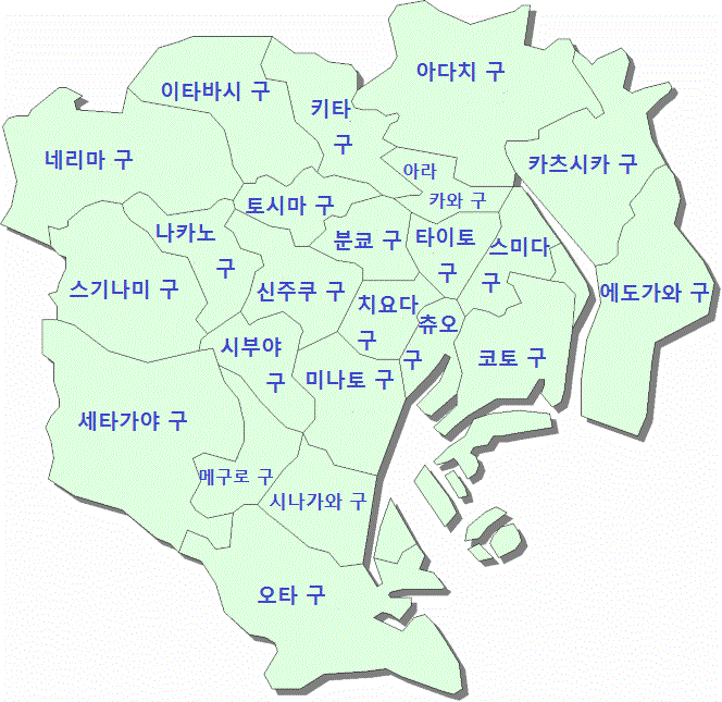 ㄴ시부야, 주오, 신주쿠, 이케부쿠로, 롯폰기, 미나토, 지요다, 시나가와, 메구로구