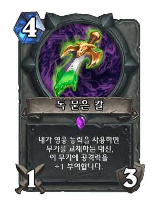 4코나 되는데 스탯은 1/3으로 씹서의 뿅망치보다 못하고 공격력을 올리려면 매 턴마다 2코스트를 들여서 영능을 눌러줘야만 공격력이 +1 오른다는 해괴한 옵션을 가지고 있다.