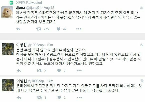 그리고, 이병헌 감독에게 스타트렉 행사에 돈주고 참가하냐고 일.침.을 가했다가, 반박당하자, 삭제하고 튀었다. 정말로 강철과 같은 신념을 가지고 있다.
