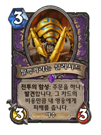 3코 3/3 야수, 전투의 함성:주문을 발견합니다. 발견한 주문의 비용만큼 내 영웅에게 피해를 줍니다.