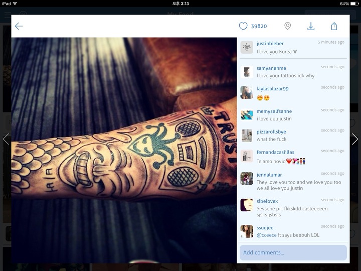 저스틴 비버 저 새끼가 지 팔에다가 비버라고 적은게 90도 돌리니까