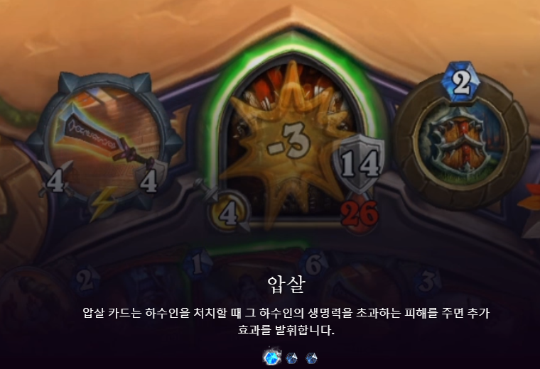 압살 카드는 하수인을 처치할 때 그 하수인의 생명력을 초과하는 피해를 주면 추가 효과가 발동한다.