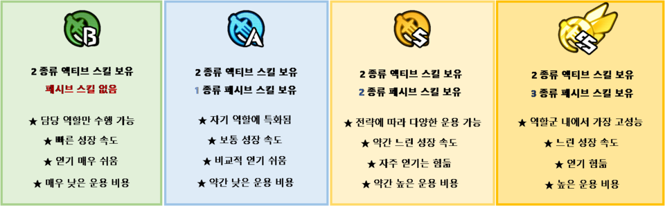 그래서 A급부터 좀 쓸만해지고, S급이 가장 좋은 범용성을 가지고 있다. SS급은 워낙 특성이 개성적이라 SS급만 밀어붙이는 전략은 좀 비효율적이고 다른 캐릭터들과 조합을 잘 짜야 최고의 효율을 낼 수 있다. 근데 현상황에선 SS급이 버그나 스킬의 구조적 문제로 그렇게까지 고평가받는 SS급은 많지 않다.