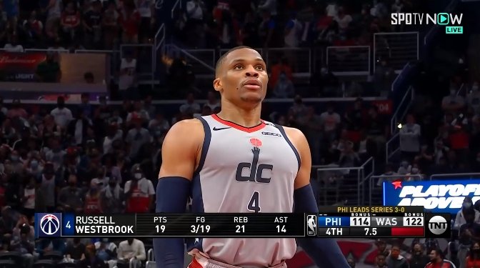 5월 11일자로 오스카 로버트슨의 181개의 트리플 더블 기록을 넘어섰다. 애틀란타전이었는데 해당경기에서 숙제를 마치자마자 고삐풀린 망아지마냥 클러치에 폭주하셨는데 끝내 회심의 역전3점을 기대를 져버리지 않고 팅- 하셔서 팀이 졌다. 5월 평균 스탯이 25 - 15 - 15다ㅋㅋ 생애 네번째 평균트더시즌 달성과 어시왕, 트더 기록 갱신까지 의미있는 시즌이었다. 특히 181개의 트더를 40년만에 경신한건 진짜 의미있고 역사적인 일인데 버럭신이라 그 업적이 퇴색되는 경향은 어쩔수없다ㅋ 1차스탯 볼륨은 역사인데 per은 20이 안되고 ts는 리그 평균이하이다. 이것도 꽤 끌어올린 수치인데도 스탯볼륨에비해 효율이 터무니없이 낮다. 빌스찌의 득점력과 버럭신의 폭발력으로 커버하고는 있지만 냉정히 똥부 10위가 간당간당한 팀에서 스탯만 찍었다는 해석도 된다. 다만 경기수로만 따져도 두시즌넘는 수를 트더로 기록했다. 스찌라 치더라도 이정도면 스찌를 넘어선 그 무언가인데 나중에 어떤 평가를 들을지 궁금하다. 어찌됐든 초반 씹구데기 그 자체였던 워싱턴을 어찌됐든 플레이 인 토너먼트까지 견인한 점은 부인할수 없는 버럭신의 공이다. 플옵에 진출할수 있을지 귀추가 주목된다.