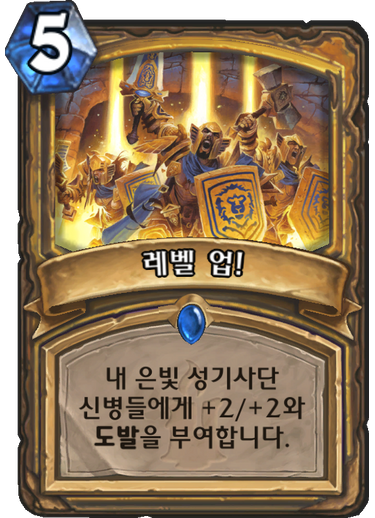 레벨 업!은 정규 포맷 홀수 성기사의 가장 중요한 승리 플랜이었지만 너프를 당하고 덱에서 빠지게 될 것입니다. 6마나 레벨업은 그다지 좋지 않은 수준이며 짝수 성기사나 어떠한 형태의 미드레인지 성기사 덱에도 쓰이지 않을 것이라 생각합니다. |