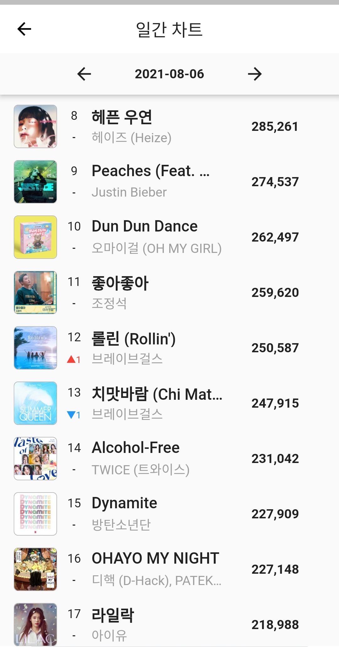 아직도 화력이 ㅈㄴ 세다. NCT, 오마이걸, 아이유와의 일기토에서도 상위를 사수하고 있고 운전만해가 10위권 내로 치고 올라온 형세를 보인다.