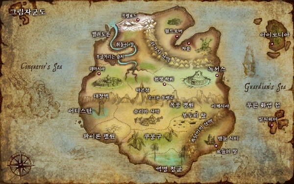 세계의 이름은 룬테라, 짤에 있는 대륙 이름이 발로란 이다. 구 지도는 지진 참 잘 나게 생겼다. 신 지도도 과연...?