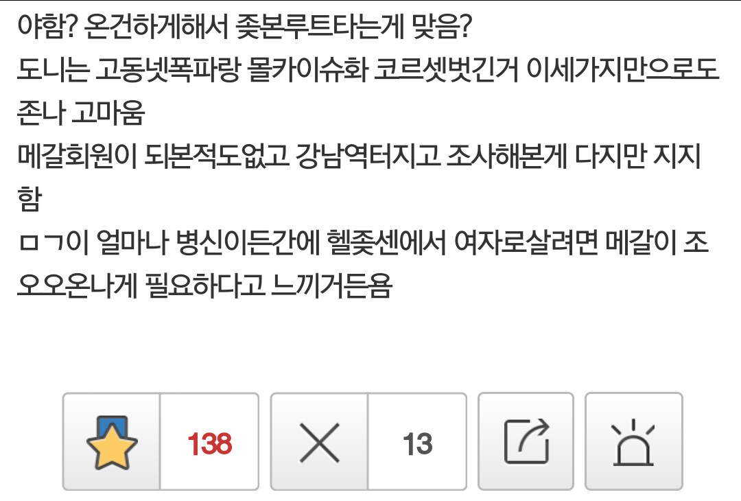 이런 년들이 현실에서 뭐하고 사는지는 대략 견적이 나오긴 하는데 제발 내 옆에만 오지마라;; ㅅㅂ 지하철에서 옆자리 안경여드름 여자가 폰으로 여기 갤질하는거 봤는데 ㄹㅇ 소름돋았다