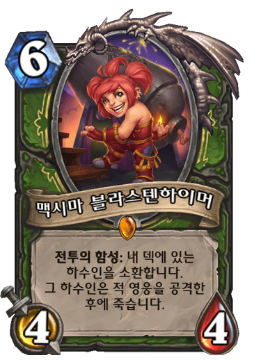 6코 4/4 전투의 함성: 내 덱에 있는 하수인을 소환합니다. 그 하수인은 적 영웅을 공격한 후에 죽습니다.