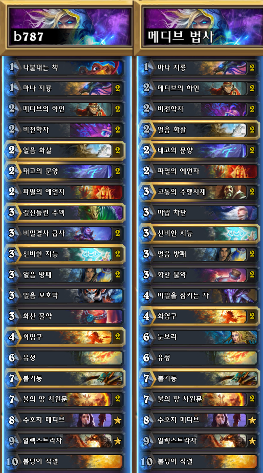 좆사기 덱이지만 요즘은 비밀법사랑 얼방법사가 나란히 1티어고 번메이지는 2티어다. 결론은 법챙은 다 사기다. 씨발년들