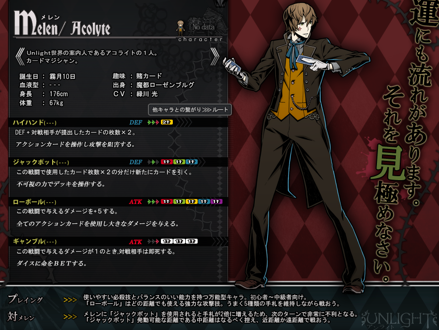 언라이트 세계의 안내인으로 어콜라이트 중 한 사람. 카드 매지션.