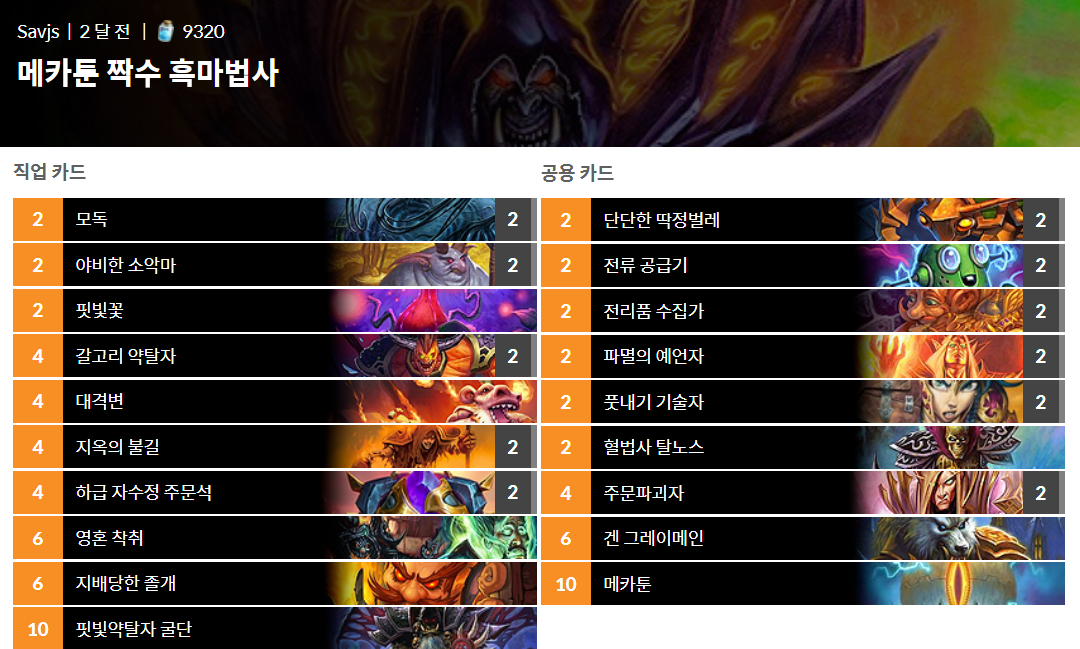 이젠 흑마 퀘스트까지 넣고 좆날먹벽덱이 됐다. 그나마의 순기능은 갈라크론드의 부활 영웅 모험모드를 날먹하는 데 유용하다.
