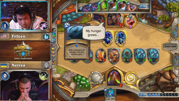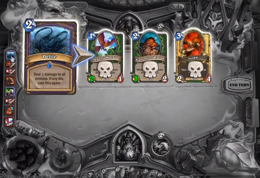 5/3, 6/6 데몬으로 공허군주 한마리 씩 때리는거까진 똑같고 5/3 데몬은 죽고 탈노스를 소환한다. 주문+1뎀을 받아 필멸의 고리를 느조스한테 때려넣으면