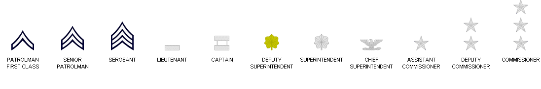 갈매기 모양처럼 생긴것을 쉐브론(Chevron)이라고하는데 Sergeant(경사)까지는 이걸 쓰고 경위부터는 미 육군 장교와 동일한 계급장을 사용한다.