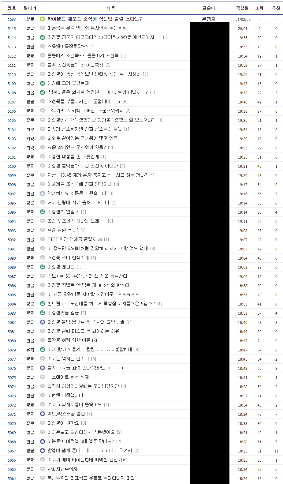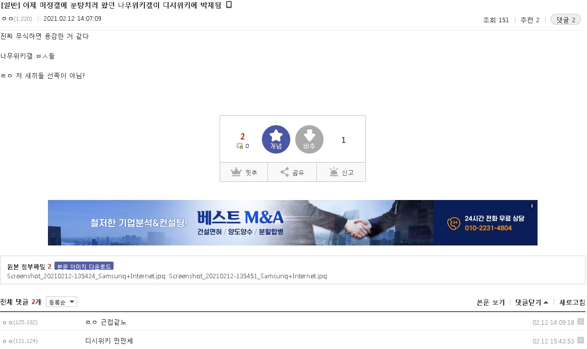— 미정갤의 힌 개추 많은 글과 그 글에 달린 댓글
