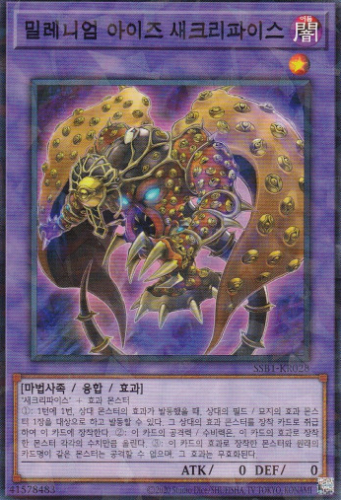 "새크리파이스" + 효과 몬스터 ①: 1턴에 1번, 상대 몬스터의 효과가 발동했을 때, 상대 필드 / 묘지의 효과 몬스터 1장을 대상으로 하고 발동할 수 있다. 그 상대의 효과 몬스터를 장착 카드로 취급하여 이 카드에 장착한다. ②: 이 카드의 공격력 / 수비력은, 이 카드의 효과로 장착한 몬스터의 각각의 수치만큼 올린다. ③: 이 카드의 효과로 장착한 몬스터와 원래 카드명이 같은 몬스터는 공격할 수 없고, 그 효과는 무효화된다.