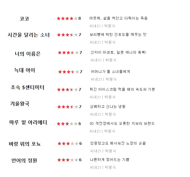 유독 애니메이션 영화에 대해서는 굉장히 관대한데, 성향이 다른 디즈니 애니나 재패니메이션 모두에게 후한 점수를 주는 것으로 봐서 애니메이션 자체를 좋아하는 듯하다.