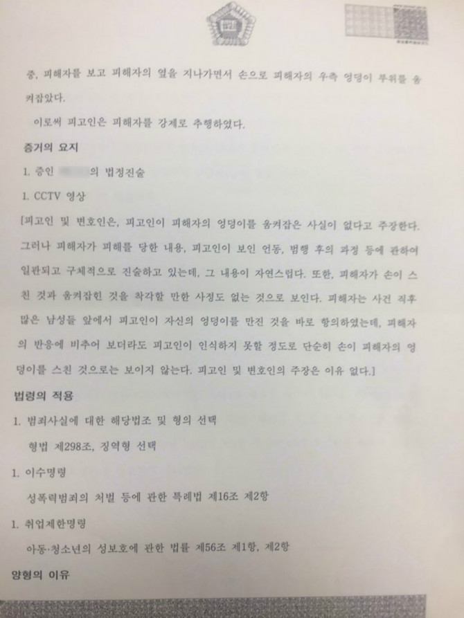 또한, 피해자가 손이 스친 것과 움켜잡힌 것을 착각할 사정도 없는 것으로 보인다.(그걸 어떻게 알아?)