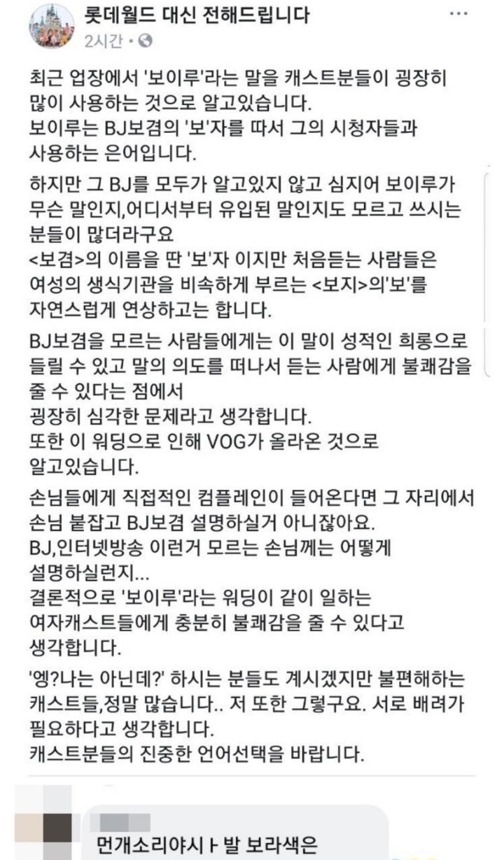 팡주팡역시의 어떤 중학교에서 '보이루는 여혐 단어로 변질이 됐으니 쓰지 말자'는 대자보를 붙인 페미 꿈나무 여학생이 남급식들에게 폭언과 폭행을 당하는 사건이 일어났다고 한다.