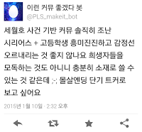 그리고 뭐만 하면 연성해주세요 하는 말버릇 이거 제발 고쳤으면 좋겠다. 근거 없는 허위사실이랑 실제 벌어진 사건(예를 들면 세월호) 갖다놓고 연성해주세요 거리는 꼬라지가 개좆같다. 최소한 할 말이 있고 안 할 말이 있어야지 이딴 식으로 피해자나 희생자들 희화화하니까 좋냐 좀 그만 하면 안 되냐?