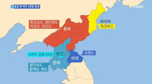 사진은 중국이 제안한 북한 분할론 중에 하나이다. 평소와 같이 양심 없게도 지네가 땅 제일많이 쳐먹고 동해도 진출하고 싶어서 은그슬쩍 거기까지 발을 걸쳐 놓았다. 근데 사실 중국도 북한 분할까지 가는 것 보단 현상 유지 상태로 북한이 어그로 받는게 이득이라 별 의미없는 자료긴 하다.