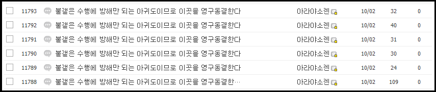 대부분의 인원이 선불교갤러리로 대피하자, 이에 격분한 아라야소렌이 금지어 설정을 적용해 한글 및 영문의 거의 모든 글자를 금지어로 등록해버리고 갤을 준폐쇄시킨 것.