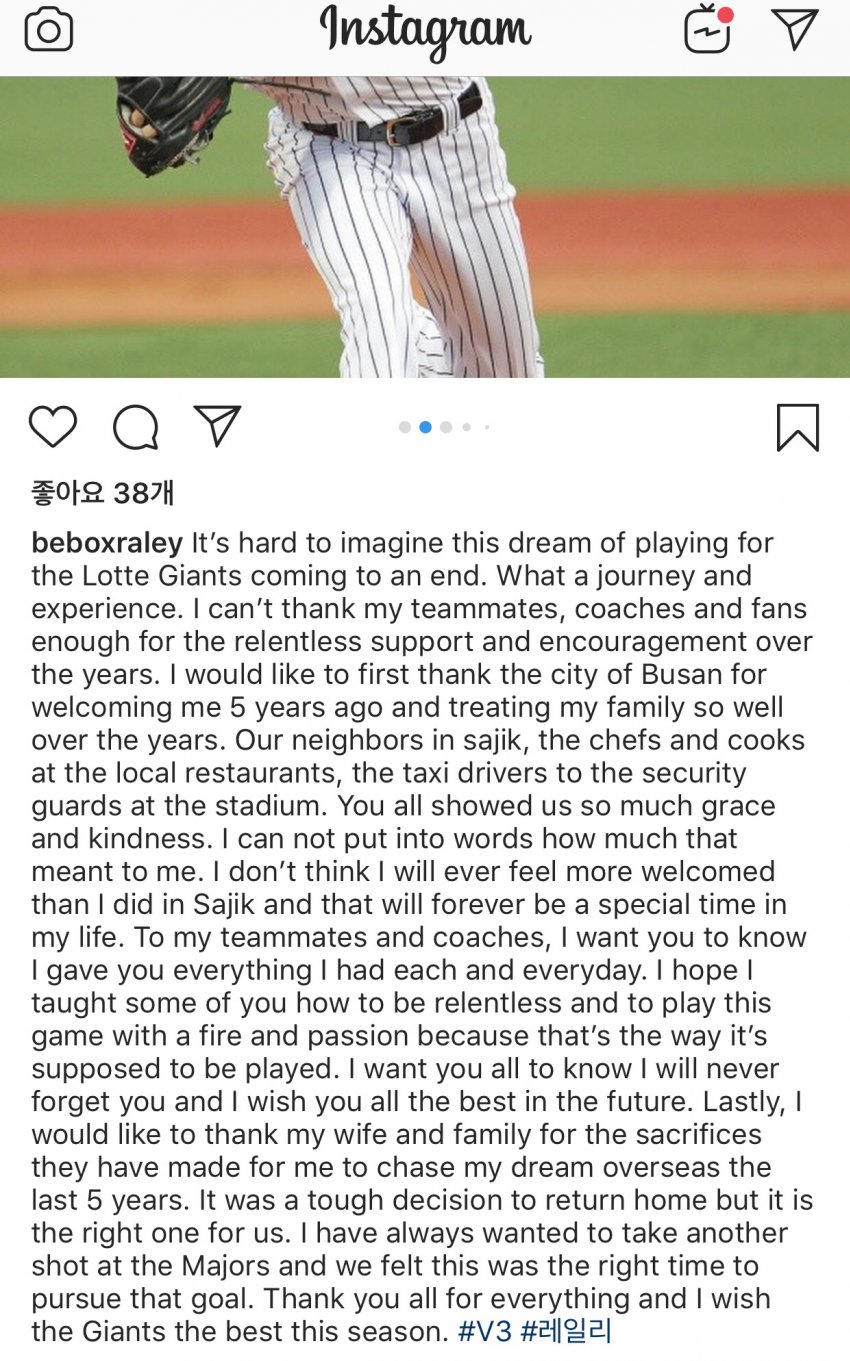 다시 메이저리그에 도전할 것으로 보이며, 떠나면서 롯데와 부산에 감사하고, 평생 특별한 시간으로 기억에 남을것이란 말을 남겼다.