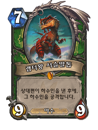 공체합이 7코 9/9라는 미친 스펙에 야수 종족값이 붙었고 적 하수인이 상대의 손에서 나오면 자동으로 그 하수인을 공격한다.
