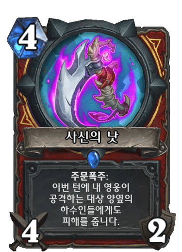 4코 4/2, 주문폭주: 이번 턴에 내 영웅이 공격하는 대상 양옆의 하수인들에게도 피해를 줍니다.